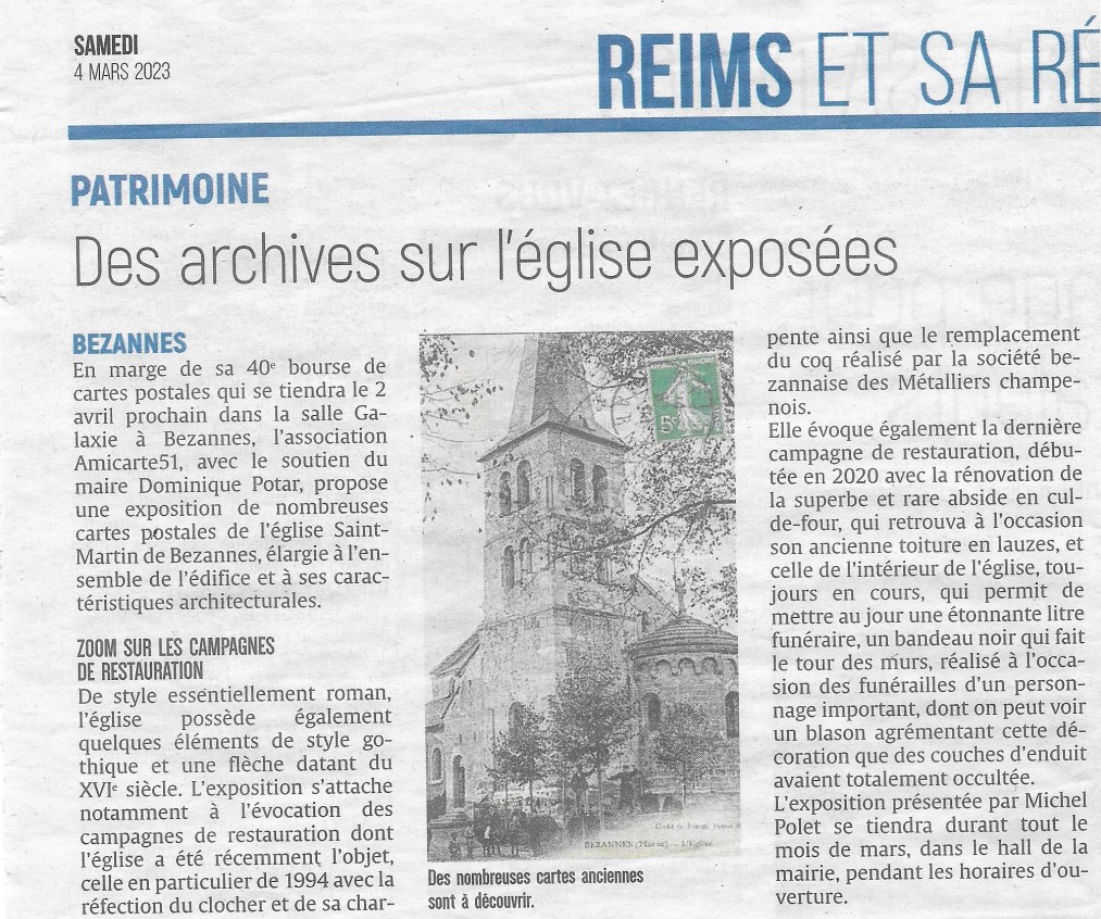 Samedi 4 mars 2023: l'expo sur l'église de Bezannes dans le journal "L'UNION"