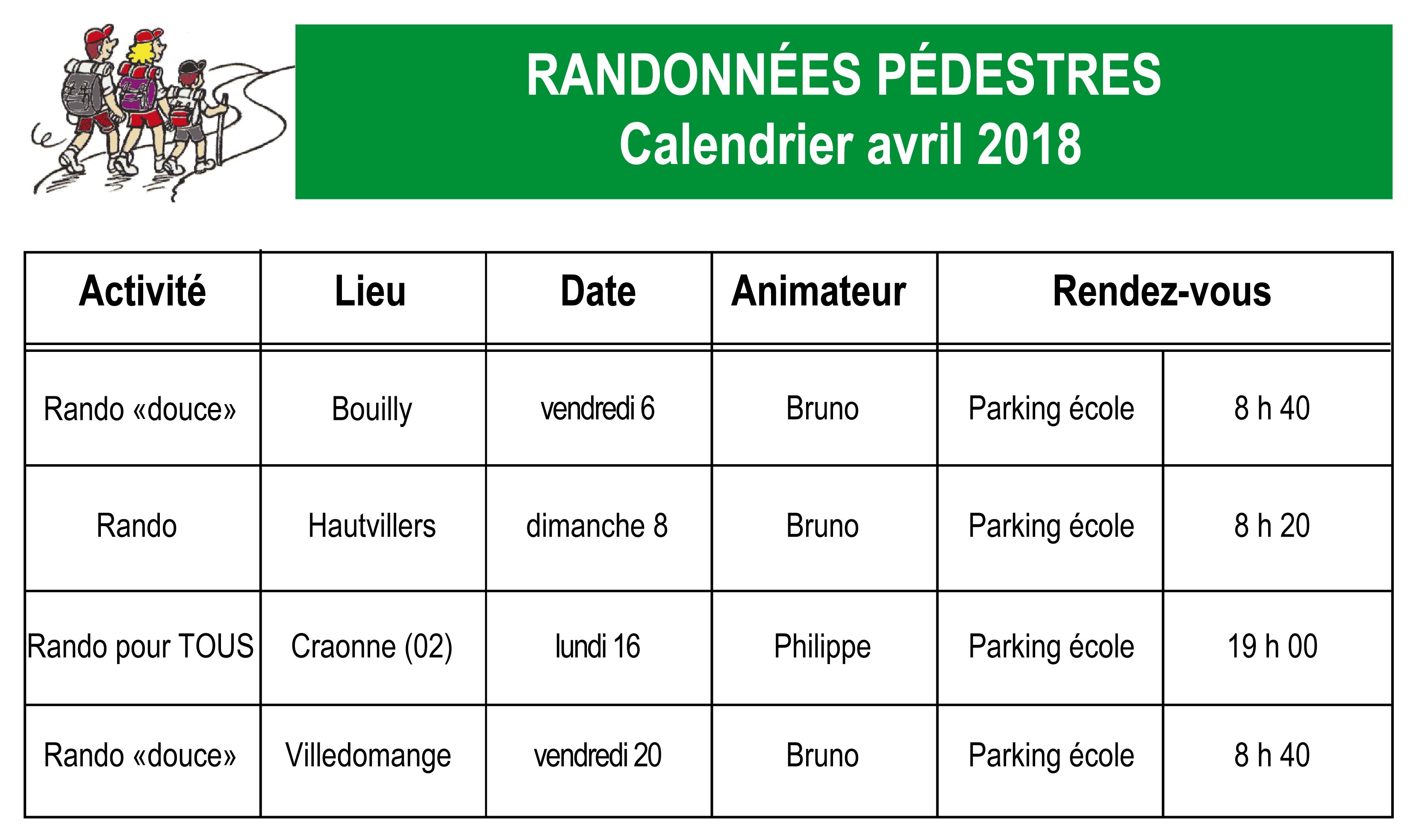 - Le calendrier des randonnées pédestres du mois de mars 2018