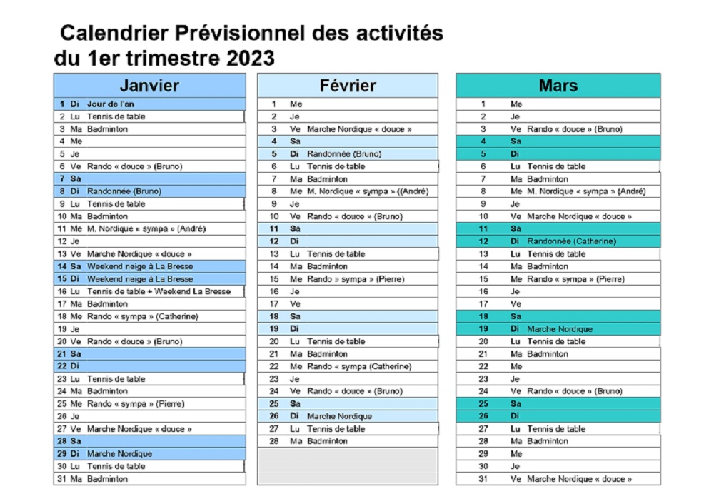 Un calendrier mensuel précise les dates exactes et les lieux des randonnées et marches nordiques