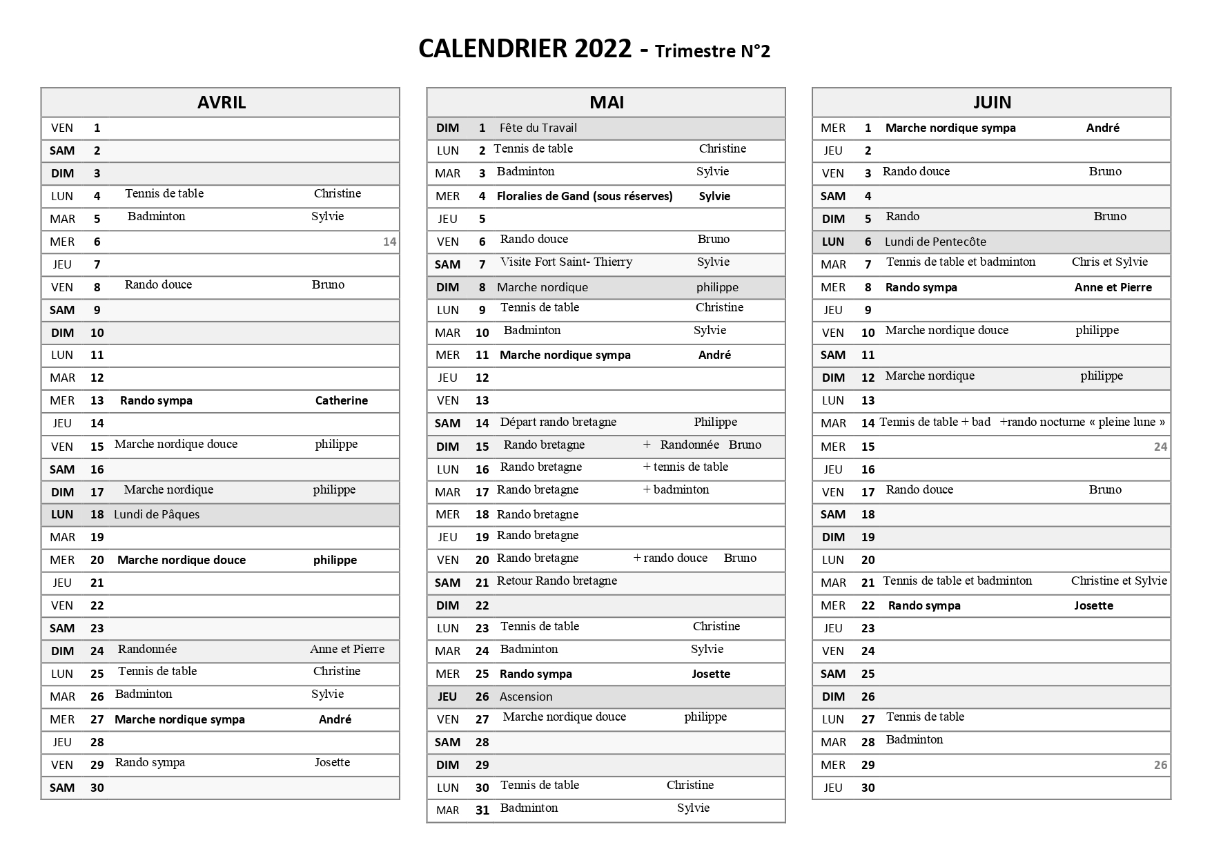 - lundi 25 avril :pas de tennis de table, pour cause de bureau de vote ; la séance est reporté au mardi 25 avril