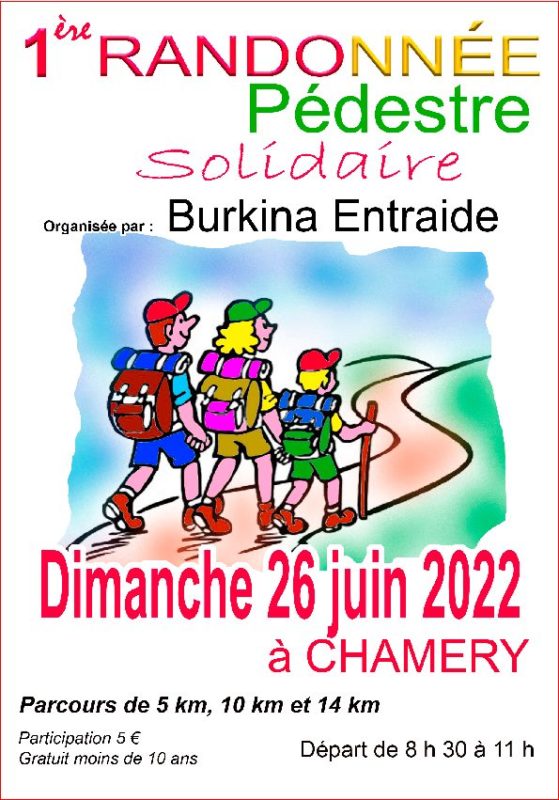 Randonnée pédestre “Entre vignes et forêts” au départ de Chamery Organisée par l’Association" Burkina entraide". Les départs seront possibles de 8 h 30 à 11 h pour un retour avant 15 h. Vous aurez le choix entre 3 circuits : 5, 10 et 14 km. Un ravitaillement sera proposé dans tous les cas.