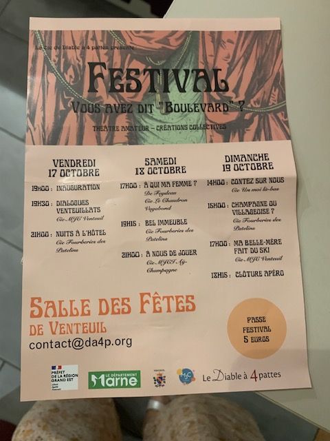 Venteuil, c’est joli, tu y es déjà allé en rando ; tu connais le chemin pour y aller; tu peux donc y retourner pour voir du spectacle dit « de boulevard ». des spectacles de boulevard alors que dans ce petit village , il n’y a toute l’année que des chemins, des ruelles et des rues , c’est paradoxal, n’est-ce pas?